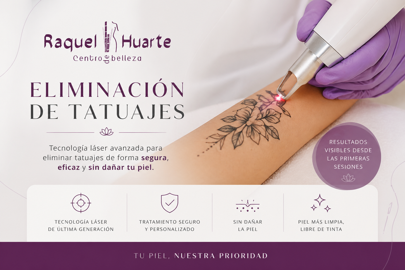 En Raquel Huarte Centro de Belleza trabajamos con tecnología láser avanzada para eliminar tatuajes de forma segura, progresiva y eficaz, respetando al máximo la piel.